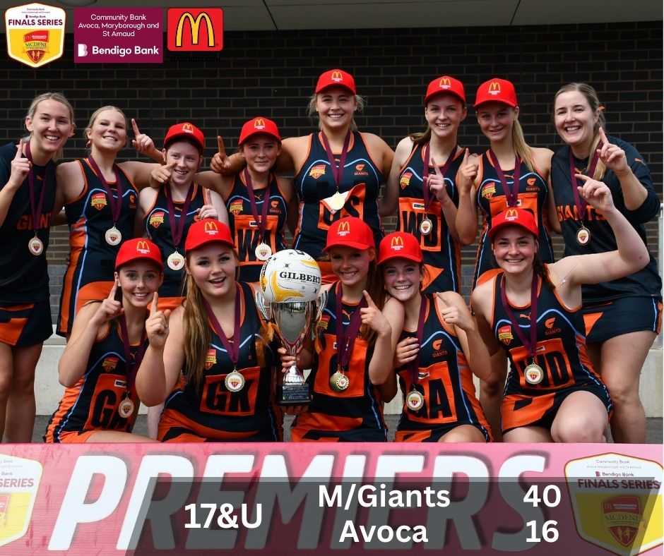 The Maryborough Giants won the 2025 premiership in the 17 & Under Netball defeating Avoca very comfortably 40 to 16.